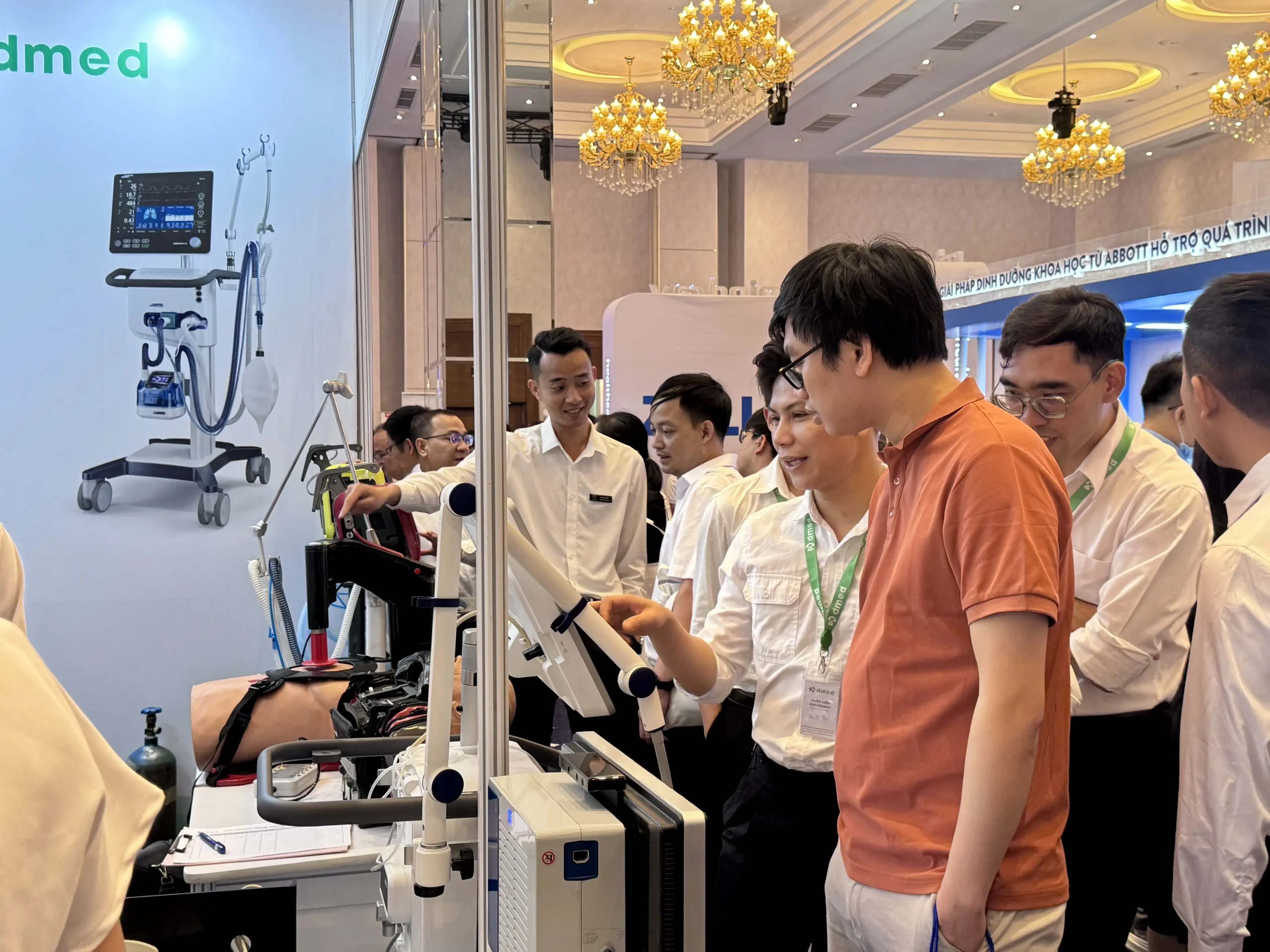 Trong khi đó, tại gian hàng trưng bày sản phẩm của DMED, rất nhiều khách hàng trong nước & các chuyên gia quốc tế đến tham quan và quan tâm nhiều đến sản phẩm chuyên dụng trong Hồi sức & Cấp cứu do công ty chúng tôi phân phối.